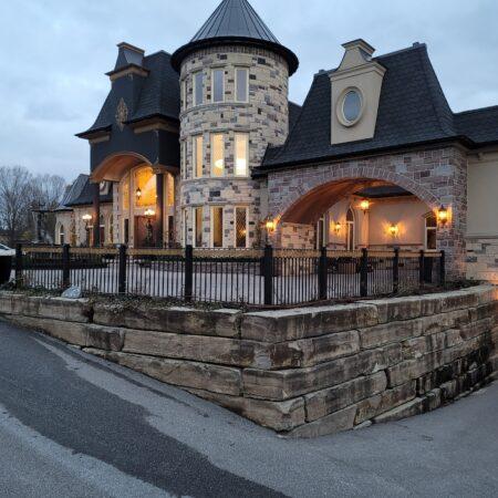 This design presents a timeless and elegant look with a traditional metal railing that features intricate ornamental detailing. The black metal railing, with its rounded geometric patterns, provides a sophisticated barrier while enhancing the visual appeal of the porch area. The railings are mounted on a stone foundation, adding a touch of classic architectural charm that complements the brick exterior of the home. The stone steps and columns frame the entryway, creating a grand and inviting atmosphere. This design is ideal for homes seeking a blend of classic elegance and durable functionality.