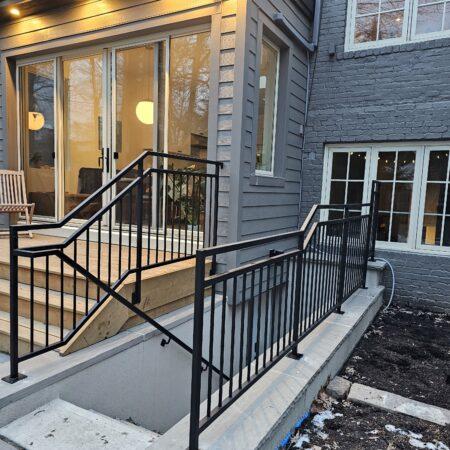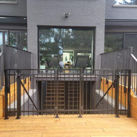 This design showcases a modern industrial aesthetic, combining a robust black metal railing with warm, natural wood decking. The railing features vertical metal balusters, which provide a sleek and sturdy barrier without obstructing the view of the outdoor space. The black matte finish of the metal railing contrasts beautifully with the light wood steps and deck, adding a contemporary touch to the overall design. The natural wood, with its visible grain and warm tones, softens the industrial feel, creating an inviting and balanced look. This design is perfect for modern homes seeking a blend of industrial durability and natural charm.