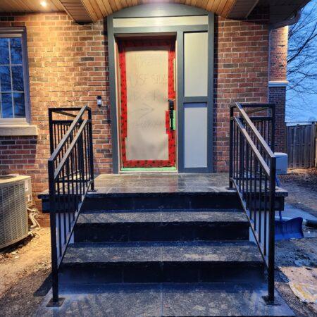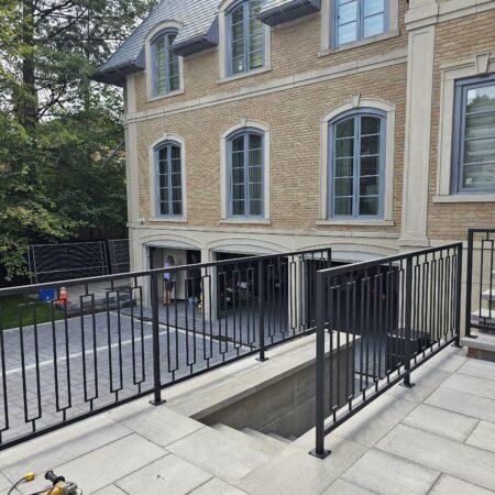 This contemporary design features a striking geometric metal railing with clean, angular accents that create a unique and modern look. The matte black finish provides a bold contrast against the light-colored stone steps and the red brick exterior, giving the space a sleek yet welcoming appeal. The railing’s symmetrical patterns, with diagonal and horizontal lines, add a subtle artistic touch while maintaining the structure’s functionality and safety. This design is perfect for homeowners seeking a balance between modern style and classic durability, seamlessly blending into the architecture of the home.