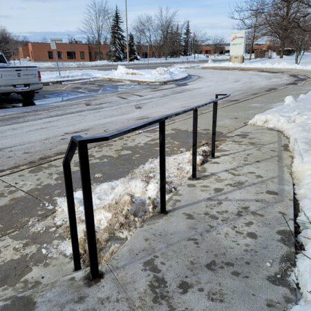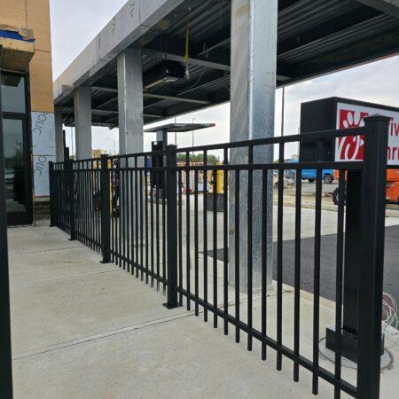 This classic design showcases a traditional metal railing with evenly spaced vertical balusters that add a sense of structure and balance to the porch area. The clean lines of the railing, finished in a sleek black matte, offer an elegant contrast to the light siding and grey accents of the home’s exterior. Subtle geometric details at the top of the railing introduce a touch of modern flair while maintaining the overall timeless appeal. Perfect for enhancing the porch’s safety and style, this design blends traditional craftsmanship with contemporary aesthetics, creating a warm and inviting entrance.